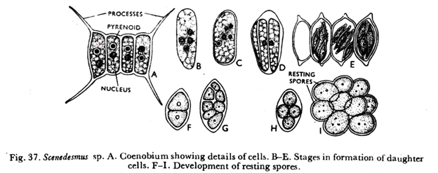 柵藻科(Scenedesmaceae)最常見的繁殖方式是通過似親孢子的形成進行無性繁殖,在親本細胞壁內,母細胞經(jīng)歷 從1到4次連續(xù)分裂為2到 16個子細胞,展開后就形成多個克隆,每個克隆的細胞數(shù)有可能不等。