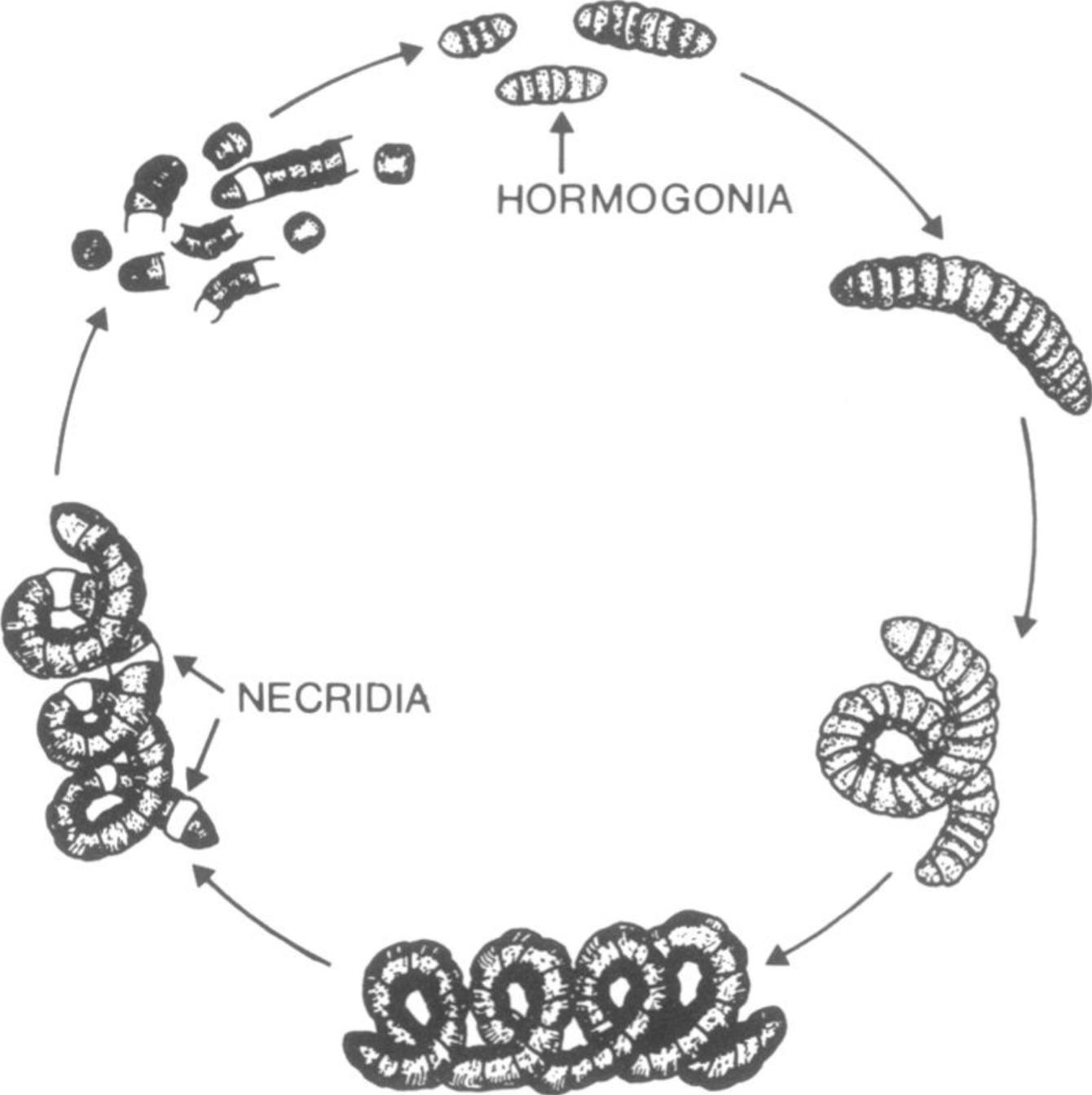 圖1.螺旋藻的生活史。 螺旋藻的繁殖,開(kāi)始可見(jiàn)在成熟的藻絲體中出現(xiàn)一種漸進(jìn)性變化的特化細(xì)胞(necridia),使藻體裂散成許多雙凹面的碟狀體,漸漸地衍變?yōu)榧s含有數(shù)個(gè)單細(xì)胞連鎖性原細(xì)胞(hormogania),這就是新生的藻絲體。在連鎖性原細(xì)胞中的單細(xì)胞失去其原附著在特化細(xì)胞上的蛋白質(zhì),終端變園,在這初期衍變過(guò)程中,胞漿呈淡藍(lán)綠色,少見(jiàn)顆粒形成。隨著細(xì)胞分裂使藻絲體中連鎖細(xì)胞數(shù)量增加,胞漿中顆粒形成,其色彩轉(zhuǎn)呈鮮艷的藍(lán)綠色,這時(shí)藻絲延長(zhǎng)而曲卷成為典型的藻絲體。(Orio Ciferri,1983)