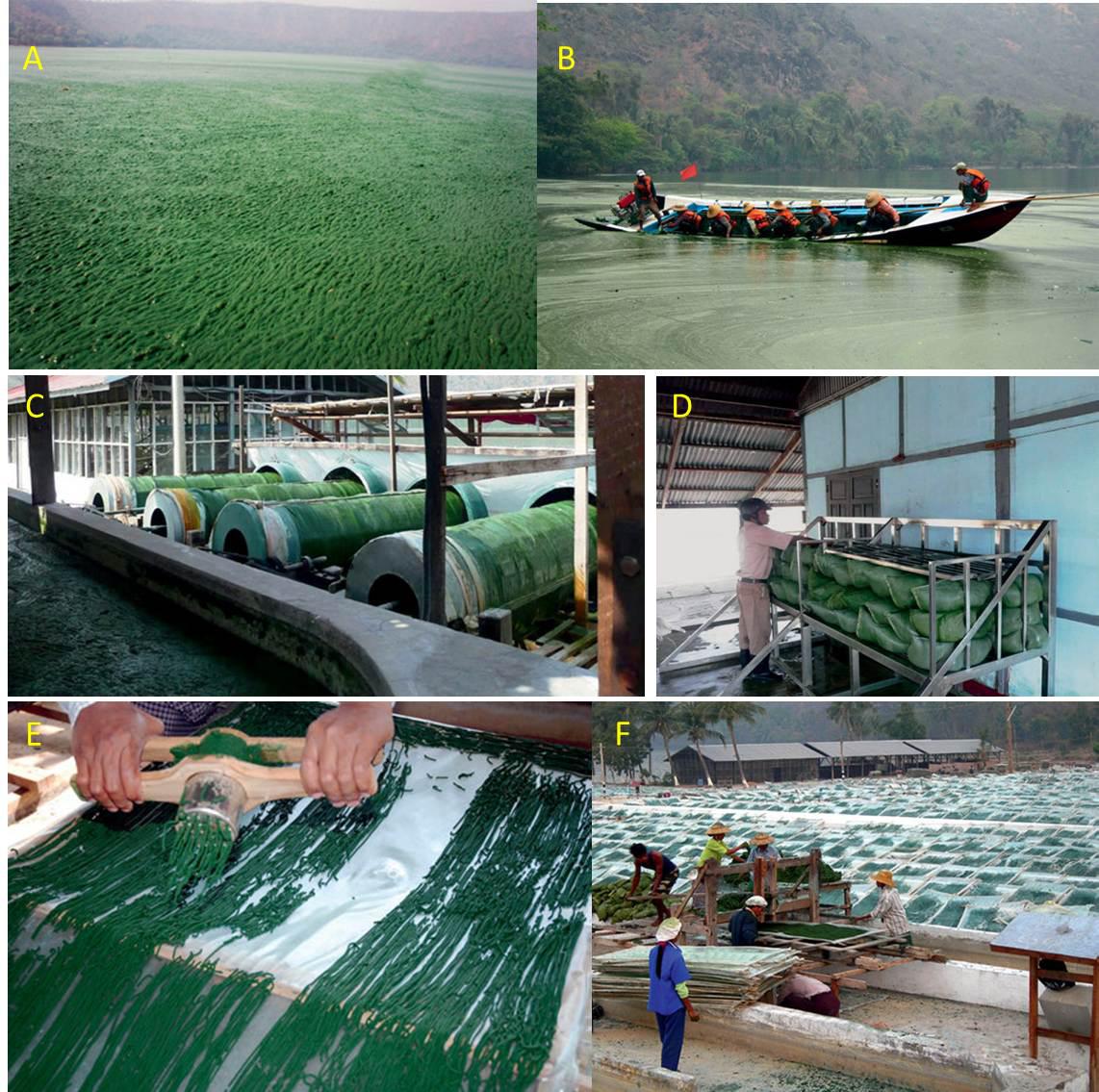 圖10. 緬甸產(chǎn)自湖泊的螺旋藻的加工方式。A.每年3月Twyn Taung湖表面厚厚一層螺旋藻藻華,B.工人駕著船采集螺旋藻,C.篩絹滾筒用于清洗螺旋藻藻泥,D.利用濾袋脫水,E.將藻泥積壓成面條狀,F(xiàn).在陽(yáng)光下曬干。