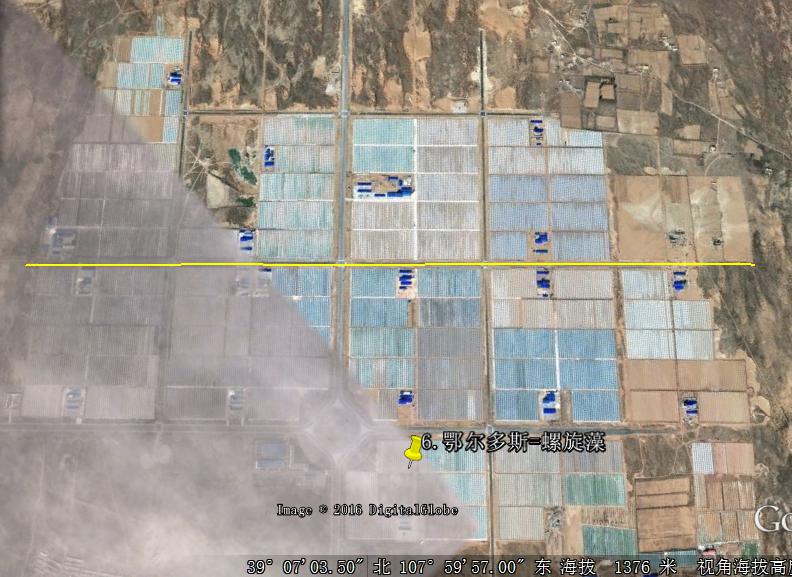 圖8.位于內(nèi)蒙古鄂爾多斯鄂托克旗螺旋藻產(chǎn)業(yè)園衛(wèi)星俯瞰圖,圖中黃線長(zhǎng)度約為2.8千米。