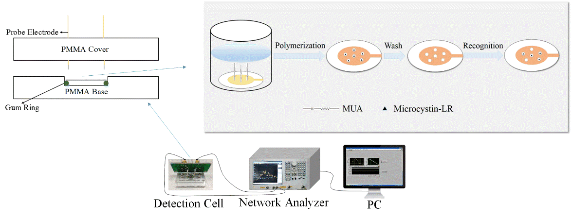 最近,蘇州醫(yī)工所微納技術(shù)研究室周連群團(tuán)隊(duì)開發(fā)出一種結(jié)合了壓電技術(shù)和分子印跡技術(shù)的微囊藻毒素LR生物傳感器,并正在研發(fā)基于壓電技術(shù)的微囊藻毒素檢測(cè)系統(tǒng)。該團(tuán)隊(duì)在20 MHz的石英微天平芯片上面通過分子自組裝及原位合成的技術(shù)修飾了針對(duì)微囊藻毒素LR特異性識(shí)別的多孔分子印跡膜。當(dāng)檢測(cè)樣品中存在微囊藻毒素LR時(shí),微囊藻毒素LR分子將被特異性吸附到壓電芯片表面分子印跡膜內(nèi),壓電芯片表面產(chǎn)生質(zhì)量變化,通過檢測(cè)壓電芯片的頻率變化來檢測(cè)微囊藻毒素LR分子吸附量。該傳感器的檢測(cè)限為0.04 nM,擁有良好的特異性,可重復(fù)性使用,并可用于實(shí)際湖水樣本中微囊藻毒素LR的檢測(cè)。