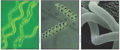 螺旋藻屬藍藻門(Cyanophyta),藍藻綱(Cyanophyceae),顫藻目(Osillatoriales),顫藻科(Oscillatoriaceae?)節(jié)旋藻屬(Arthrospira?),因早期誤分類為螺旋藻屬(Spirulina),而后約定成俗稱為螺旋藻。細胞無色素體,色素分布在原生質(zhì)外部,無細胞核。絲狀,行二分裂無性繁殖,繁殖結(jié)果使藻絲長度迅速增加。無有性生殖。生態(tài)條件:螺旋藻原生活在堿性水中,可以在淡水中培養(yǎng),也可通過逐步馴化適應在海水中生長,直到海水鹽度達到35也不產(chǎn)生藻體凝聚現(xiàn)象。常見養(yǎng)殖品種為鈍頂螺旋藻(A. platensis)和極大螺旋藻(A. maxima?)。