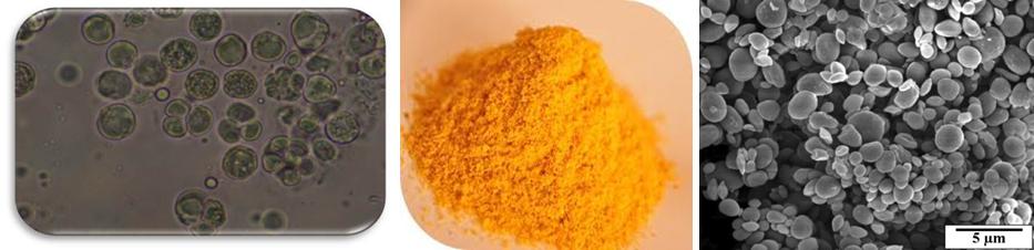 雨生紅球藻 (Haematococcus pluvialis)是一種單細胞淡水綠藻,屬于綠藻門(Chlorophata)、綠藻綱(( hlorophyceae)、 團藻目(Volvocales)、紅球藻科(Haematococcaccae)、紅球藻屬(Haematococcus)。雨生紅球藻在多種不適宜生長的外界環(huán)境條件下會在細胞核周圍的細胞質(zhì)基質(zhì)中加速積累次生類胡蘿卜素,其中80%以上為蝦青素(圖1-2)及其酯衍生物。研究證明,蝦青素的抗氧化活性比β-胡蘿卜素、玉米黃素、葉黃素和角黃素等類胡蘿卜素高10倍,比黃體素高200倍,比維生素E高550倍被稱為超級維生素E。
