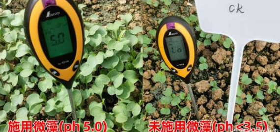 長沙市春華鎮(zhèn)蔬菜棚因土壤酸化更是表現(xiàn)出苗弱,出苗率低,缺苗等現(xiàn)象。為了解決這一現(xiàn)象,8月17日,大棚播種蘿卜時,施用了微藻產(chǎn)品,施用量為5L/畝。使用后6天,經(jīng)測量顯示PH升高到5.0。將微藻施入土壤后,經(jīng)過一段時間的定殖,會分泌有機酸或進行離子交換,調(diào)和生態(tài)位點的酸堿環(huán)境,以達到自身生存的空間,一般來說,大部分微藻最適宜的pH值在6-8左右。
