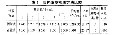 取某水廠原水用上述方法(簡稱倒置法)和國內(nèi)普遍采用的傳統(tǒng)方法(簡稱正置法)分別進行藻類檢測和計數(shù),結果見表1。