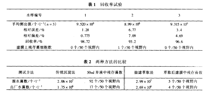 抽濾萃取法能較好地阻止藻細胞流失,但由于濾敢太小,一般只能抽濾濁度10NTU以下的水,對于源水最多只能抽濾200ML左右的水量,太多則濾孔就會被堵?而難以達到抽濾效果,所以存在取水量較少,影響代表性,如有條件,濾膜孔徑可取在1.5-1.8M,對于低濁度的出廠水和濾后水,則不存在這個問題,可抽濾200-300ml水量,而且能準確地反映水中殘存藻細胞的數(shù)量。