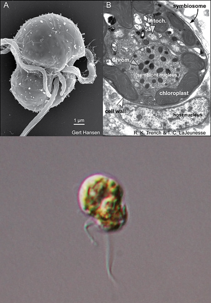 圖3. 鞭毛蟲狀態(tài)的蟲黃藻(Symbiodinium),上圖左鞭毛清晰可見,上圖右為細(xì)胞內(nèi)部結(jié)構(gòu),下圖為光鏡下的形態(tài)(下圖by Shoguchi, et al.)