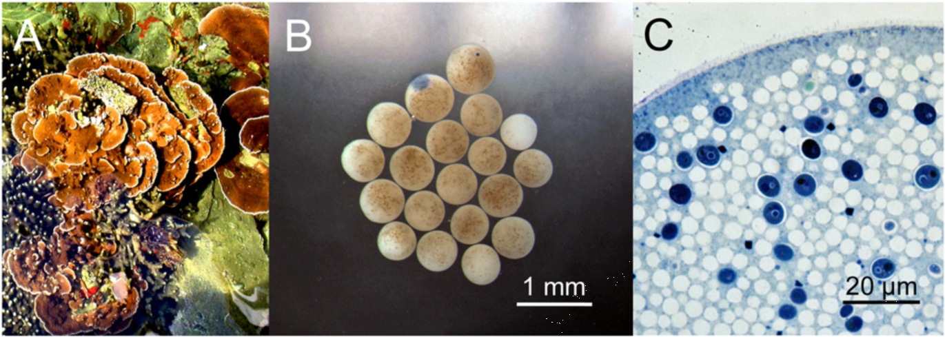 圖8. 珊瑚的蛋蛋里就含有蟲黃藻。A:夏威夷的盤狀珊瑚(Montipora 。capitata);B:外源的蟲黃藻進(jìn)入珊瑚卵中(藍(lán)色部分);C:透射電鏡顯示結(jié)合在膜上的蟲黃藻(深藍(lán)色的圈圈,白色為卵黃泡)。(by Hagedorn et al.)
