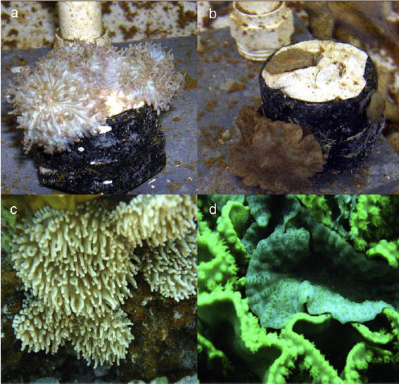 圖9. 紅海中的兩種珊瑚Rhodactis rhodostoma(左)和Discosoma unguja(右),a和b為實(shí)驗(yàn)室特定光照條件下,c和d為原生環(huán)境中,可見光線對珊瑚中的蟲黃藻影響很大。(by Kuguru et al.)