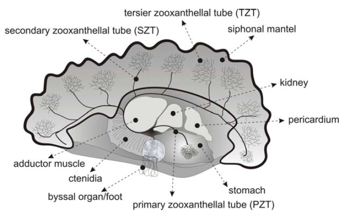有意思的是,蟲黃藻在硨磲體內(nèi)并非無序分布,硨磲體內(nèi)存在一個(gè)管道系統(tǒng),分初級、次級和三級管道,從胃部將蟲黃藻向外套膜運(yùn)輸,在充滿在三級管道中(如下圖14)。而當(dāng)外界環(huán)境不利時(shí),比如提高溫度,蟲黃藻會(huì)以目前未知的途徑,離開三級管道,到達(dá)胃部,經(jīng)過腸道和糞便一起經(jīng)直腸排泄至外部。