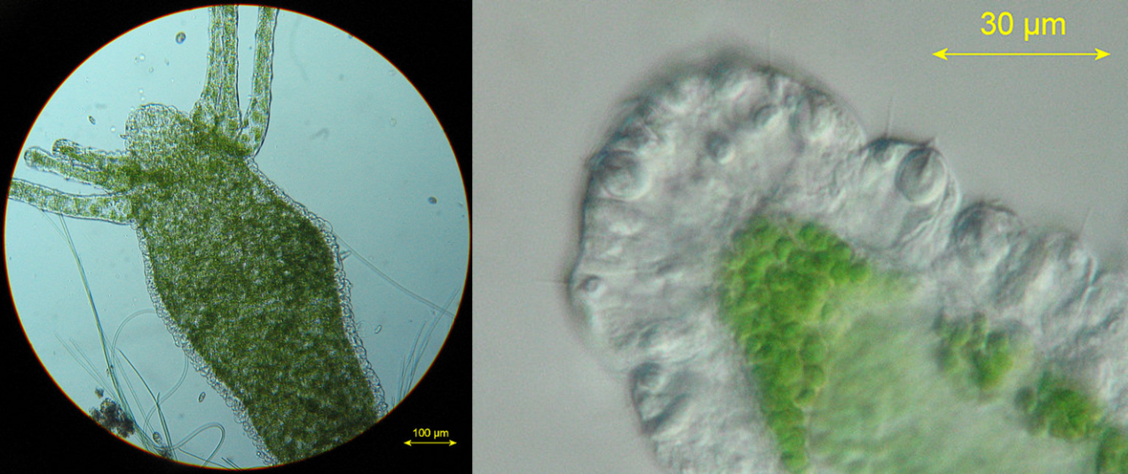 圖20. 左為水螅,右為水螅觸手,可見綠色藻細(xì)胞充雜其間(圖片引自網(wǎng)絡(luò))
