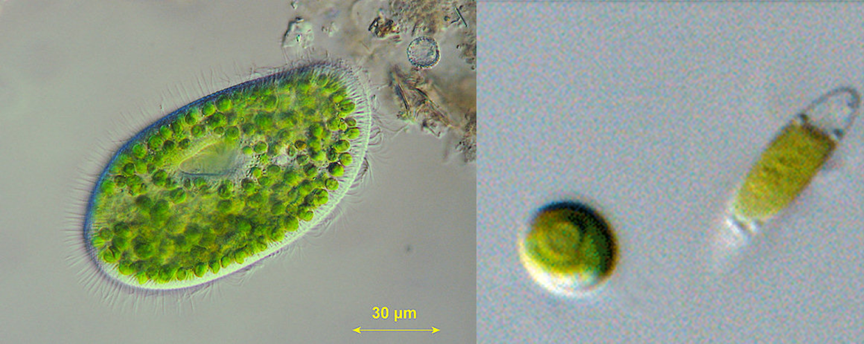 圖21.左圖為充滿了綠藻的草履蟲(圖引自網(wǎng)絡(luò));右圖為草履蟲Paramecium bursaria中發(fā)現(xiàn)的兩種共生藻,一種像小球藻(左),一種像膠球藻(右)( by Proschold et al.)