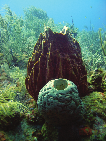 圖27. 加勒比海珊瑚礁中帶有共生藍(lán)藻的海綿Xestospongia muta (后)和Agelas sp.(前)(by Pawlik)