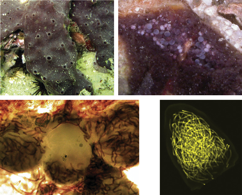 圖28. 左上:原生環(huán)境中的海綿Xestospongia bocatorensis;右上:孵育體中的海綿卵與胚胎;左下:在海綿胚胎中的纖維狀共生藍(lán)藻(海綿顫藻,Oscillatoria spongeliae);右下:海綿幼體中的共生藍(lán)藻發(fā)出的葉綠素?zé)晒?。(by Thacker?and Freeman)