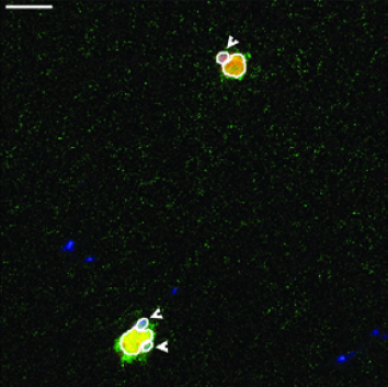 圖33.利用同位素標(biāo)記技術(shù),得到了兩種微小生物之間互相交換碳氮元素的證據(jù),箭頭所指的小細(xì)胞為具固氮功能的藍(lán)藻,大細(xì)胞為能進(jìn)行光合作用的定鞭金藻(Prymnesiophytes)。(by Rachel Foster, MPI)