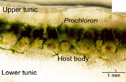 海鞘屬于脊索動(dòng)物門海鞘綱,已知的海鞘種類有三千多種,其強(qiáng)大的化學(xué)防御機(jī)制,是其能夠生存壯大的基礎(chǔ)之一。海鞘能夠大量的產(chǎn)生結(jié)構(gòu)新穎的天然產(chǎn)物(已經(jīng)分離到1000多種),可作為藥物先導(dǎo)化合物,具備抗癌、抗病毒等作用。研究證明,海鞘合成這些物質(zhì)與其共生的微生物關(guān)系密切,其中也包括了共生藍(lán)藻,常見的藍(lán)藻種類包括了原綠球藻(或稱原綠藻,Prochloron)和聚球藻(Synechocystis)。共生藍(lán)藻存在于海鞘的表面、泄殖腔和被膜中,形成一層易于識別的生物膜。