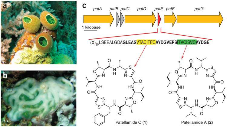 圖37. A.海鞘(D. molle);B.海鞘(L. patella);C.原綠球藻中含有的合成patellamide環(huán)肽的基因及patellamide環(huán)肽的化學(xué)結(jié)構(gòu)(by Ireland)